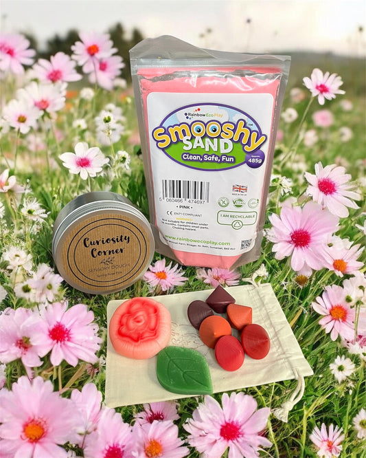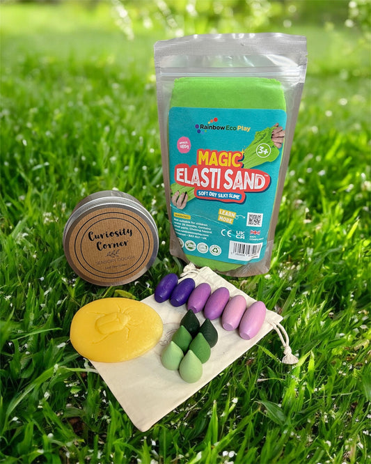 Each box is filled with UK brands we trust: Rainbow Eco’s natural mineral sands, Curiosity Corner’s handmade, scented doughs, TickiT’s responsibly sourced wooden treasures, and Yellow Door’s durable dough rollers and sensory stones. Thoughtfully chosen, safe, and built to inspire endless play.