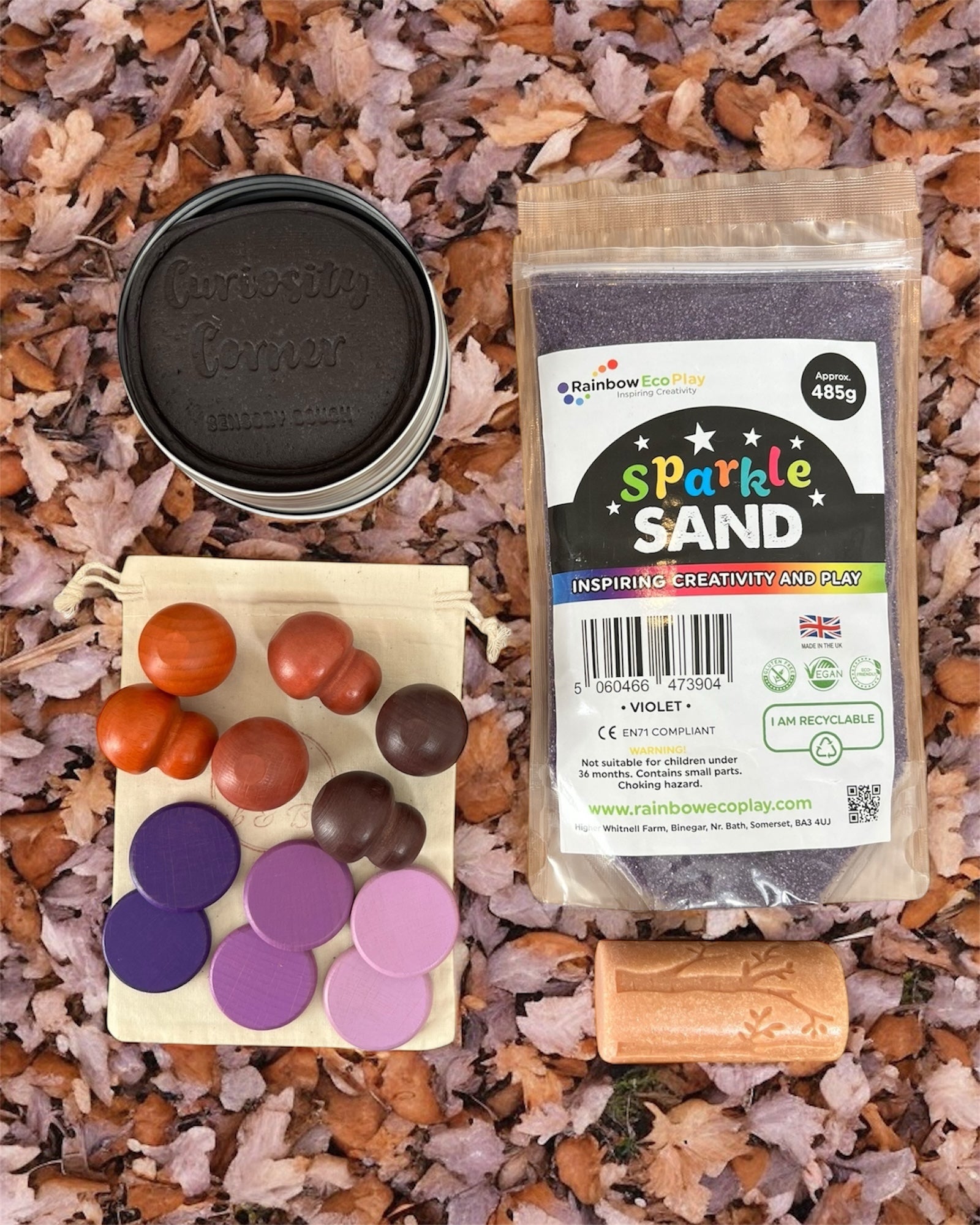 With deep violet sand and night-sky dough, this box invites calm, sensory-rich play inspired by the magic of the forest after dark. A gentle blend of texture, scent, and imagination — perfect for exploring nature’s rhythms as the day fades into night.