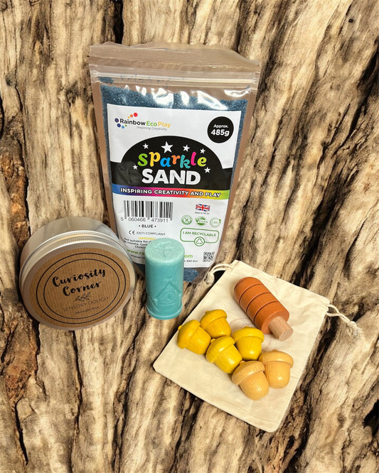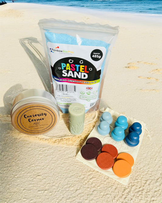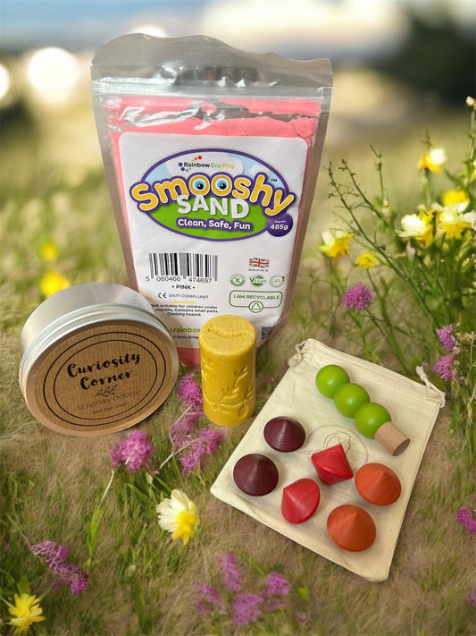 Each box is filled with UK brands we trust: Rainbow Eco’s natural mineral sands, Curiosity Corner’s handmade, scented doughs, TickiT’s responsibly sourced wooden treasures, and Yellow Door’s durable dough rollers and sensory stones. Thoughtfully chosen, safe, and built to inspire endless play.